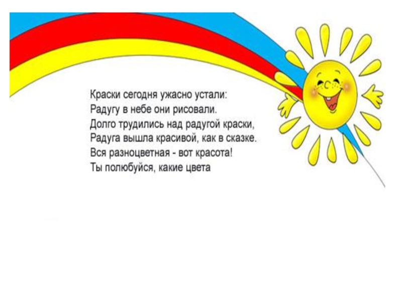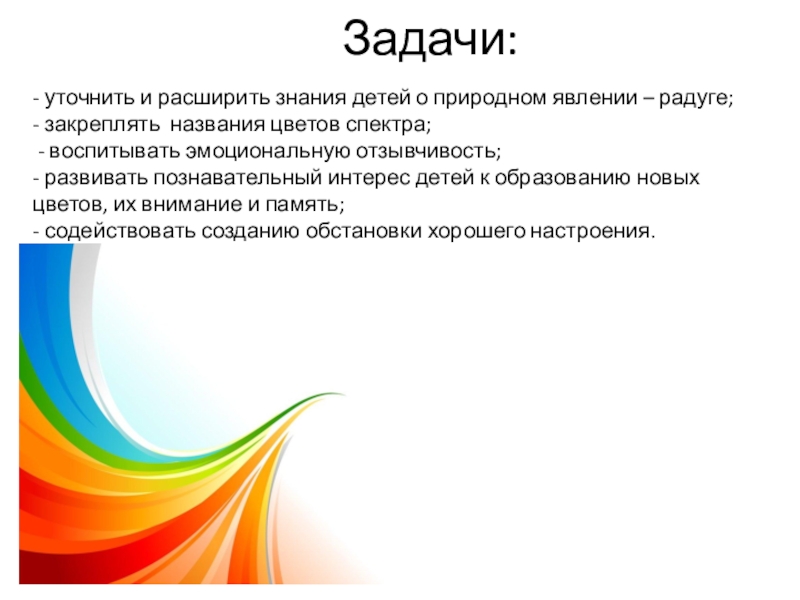 Задачи: - уточнить и расширить знания детей о природном явлении – радуге; - закреплять названия цветов спектра; - воспитывать эмоциональную отзывчивость; - развивать познавательный интерес детей к образованию новых цветов, их внимание и память; - содействовать созданию обстановки хорошего настроения.
