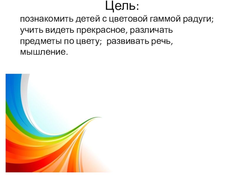 Цель: познакомить детей с цветовой гаммой радуги; учить видеть прекрасное, различать предметы по цвету; развивать речь, мышление.