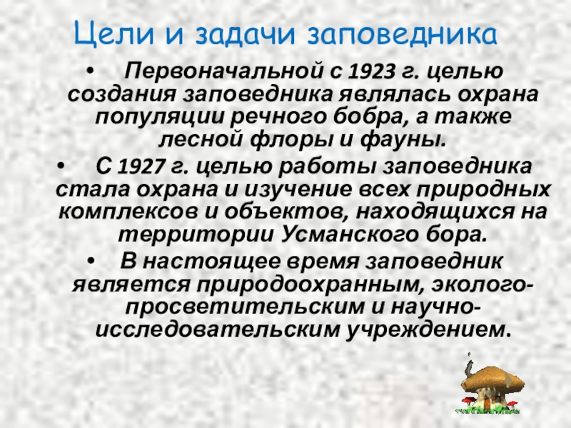 власти, в 1927 году был утвержден как заповедник всесоюзного значения. Основными задачами, поставленными в то время перед заповедником, были: сохранение и увеличение запасов бобра; сохранение ценнейших участков дубового и соснового леса.