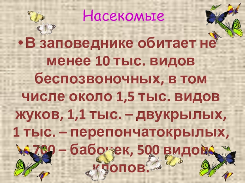 том числе около 1,5 тыс. видов жуков, 1,1 тыс. – двукрылых, 1 тыс. – перепончатокрылых, 700 – бабочек, 500 видов клопов.