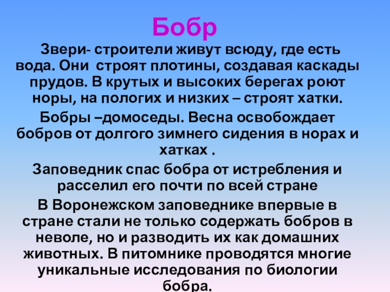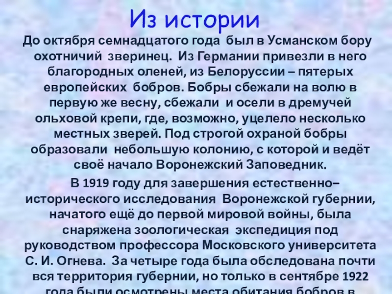 бору охотничий зверинец. Из Германии привезли в него благородных оленей, из Белоруссии – пятерых европейских бобров. Бобры сбежали на волю в первую же весну, сбежали и осели в дремучей ольховой крепи, где, возможно, уцелело несколько местных зверей. Под строгой охраной бобры образовали небольшую колонию, с которой и ведёт своё начало Воронежский Заповедник.