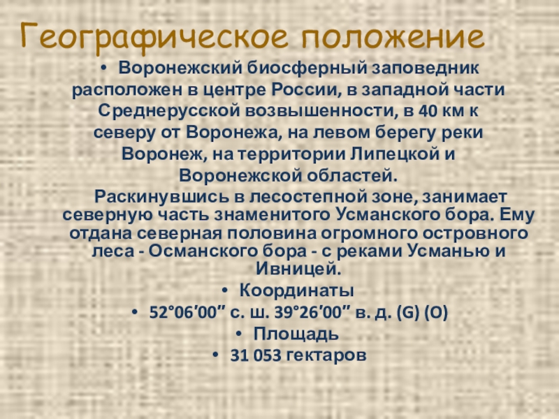Слайд 1ВОРОНЕЖСКИЙ ГОСУДАРСТВЕННЫЙ БИОСФЕРНЫЙ ЗАПОВЕДНИК