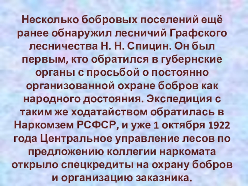 Он был первым, кто обратился в губернские органы с просьбой о постоянно организованной охране бобров как народного достояния. Экспедиция с таким же ходатайством обратилась в Наркомзем РСФСР, и уже 1 октября 1922 года Центральное управление лесов по предложению коллегии наркомата открыло спецкредиты на охрану бобров и организацию заказника.