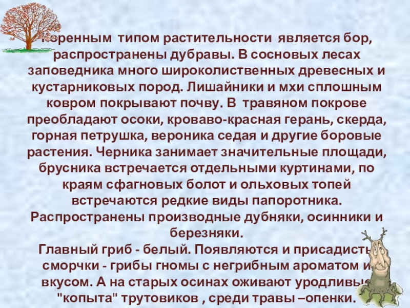 Слайд 37Коренным типом растительности является бор, распространены дубравы. В сосновых лесах заповедника