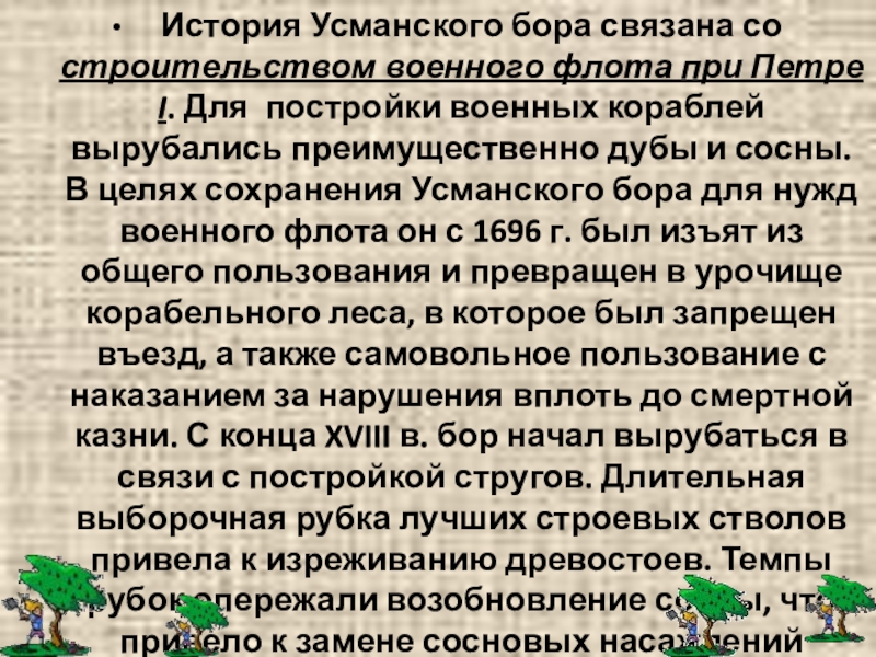 Петре I. Для постройки военных кораблей вырубались преимущественно дубы и сосны. В целях сохранения Усманского бора для нужд военного флота он с 1696 г. был изъят из общего пользования и превращен в урочище корабельного леса, в которое был запрещен въезд, а также самовольное пользование с наказанием за нарушения вплоть до смертной казни. С конца XVIII в. бор начал вырубаться в связи с постройкой стругов. Длительная выборочная рубка лучших строевых стволов привела к изреживанию древостоев. Темпы рубок опережали возобновление сосны, что привело к замене сосновых насаждений дубовыми и березовыми.