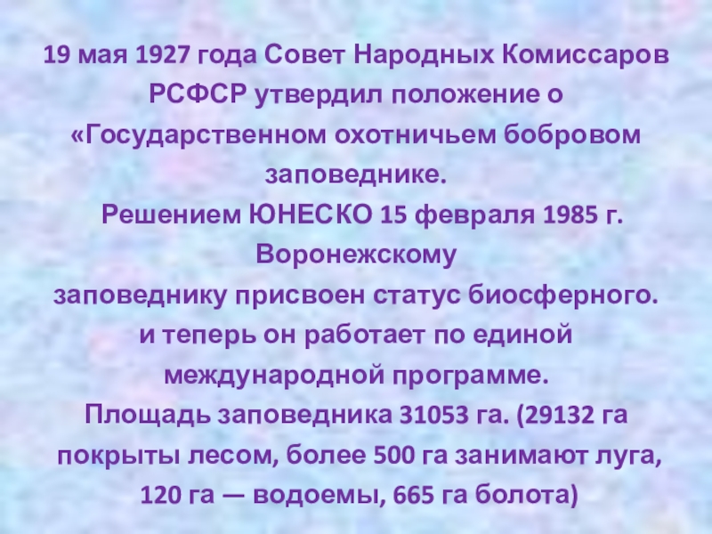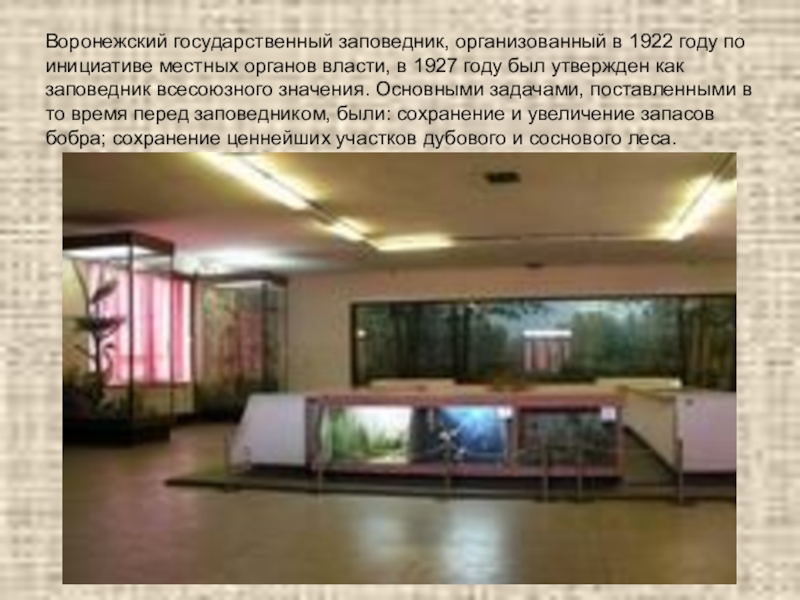 Слайд 45Воронежский государственный заповедник, организованный в 1922 году по инициативе местных органов