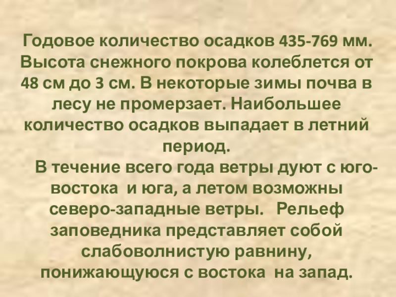 Слайд 8 Годовое количество осадков 435-769 мм. Высота снежного покрова колеблется от