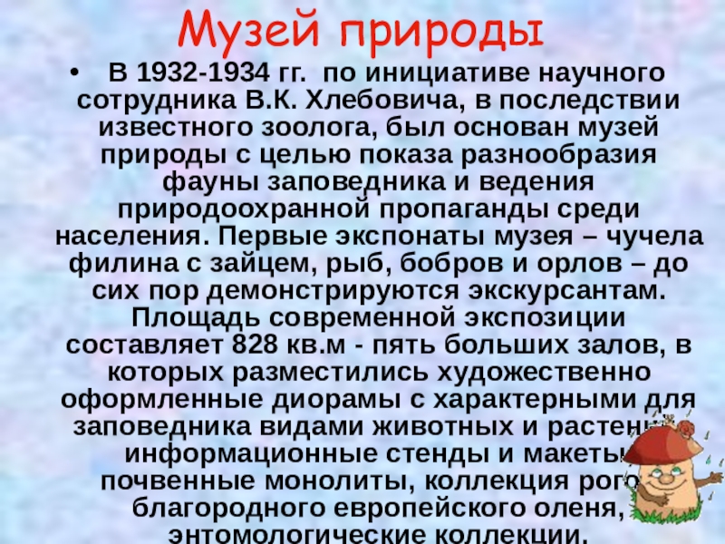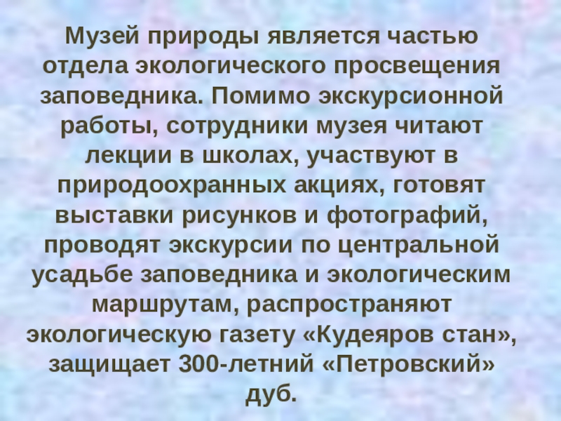 Слайд 42Музей природы является частью отдела экологического просвещения заповедника. Помимо экскурсионной работы,