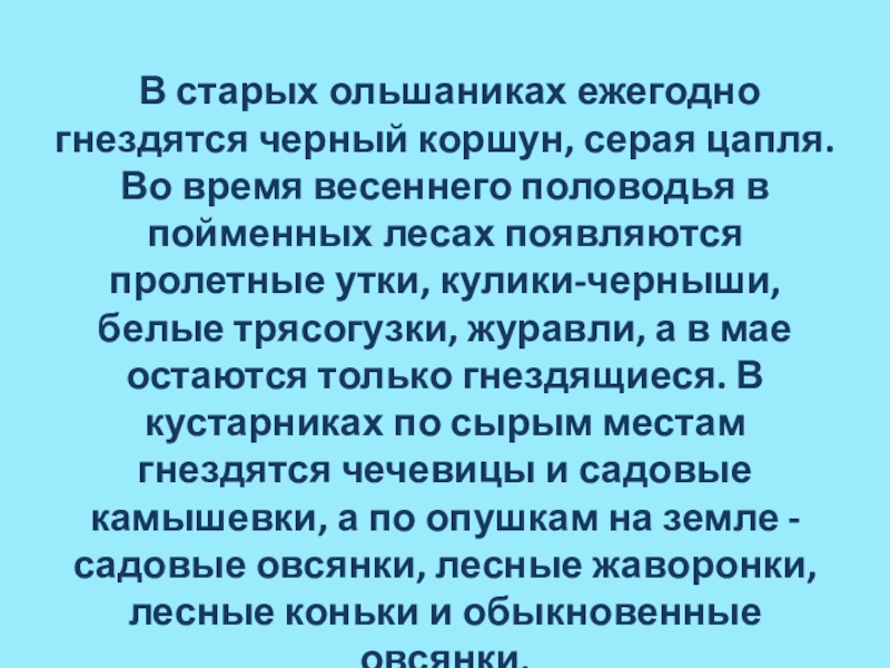 Слайд 26 В старых ольшаниках ежегодно гнездятся черный коршун, серая цапля.