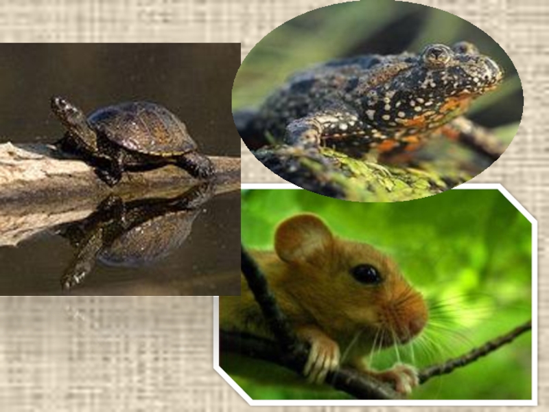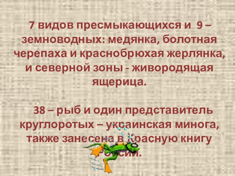 Слайд 12 7 видов пресмыкающихся и 9 – земноводных: медянка, болотная черепаха