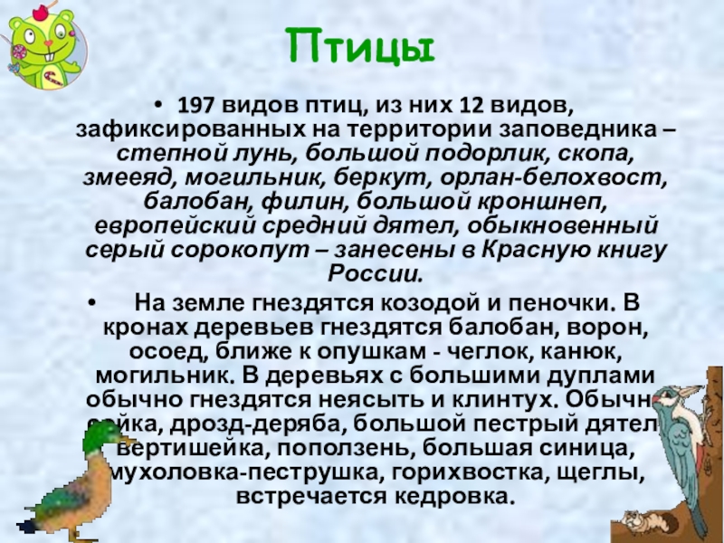 заповедника – степной лунь, большой подорлик, скопа, змееяд, могильник, беркут, орлан-белохвост, балобан, филин, большой кроншнеп, европейский средний дятел, обыкновенный серый сорокопут – занесены в Красную книгу России.