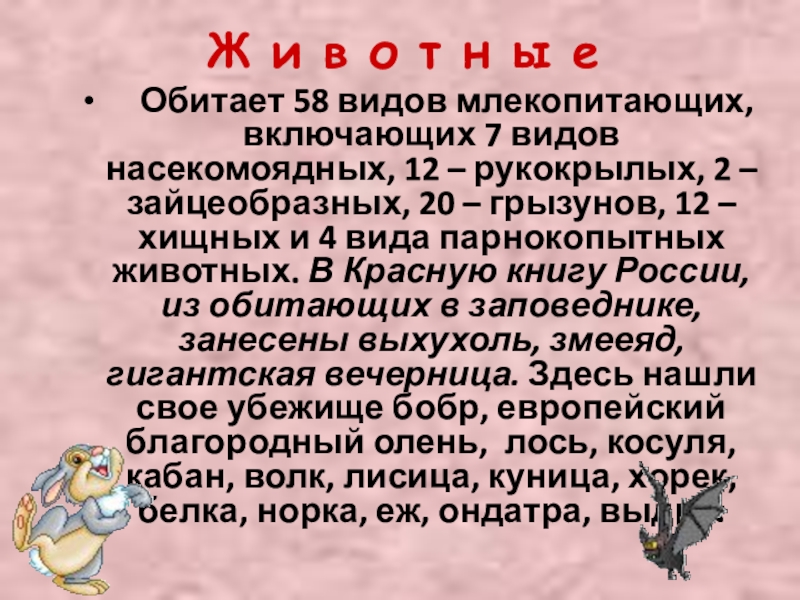 58 видов млекопитающих, включающих 7 видов насекомоядных, 12 – рукокрылых, 2 – зайцеобразных, 20 – грызунов, 12 – хищных и 4 вида парнокопытных животных. В Красную книгу России, из обитающих в заповеднике, занесены выхухоль, змееяд, гигантская вечерница. Здесь нашли свое убежище бобр, европейский благородный олень, лось, косуля, кабан, волк, лисица, куница, хорек, белка, норка, еж, ондатра, выдра.