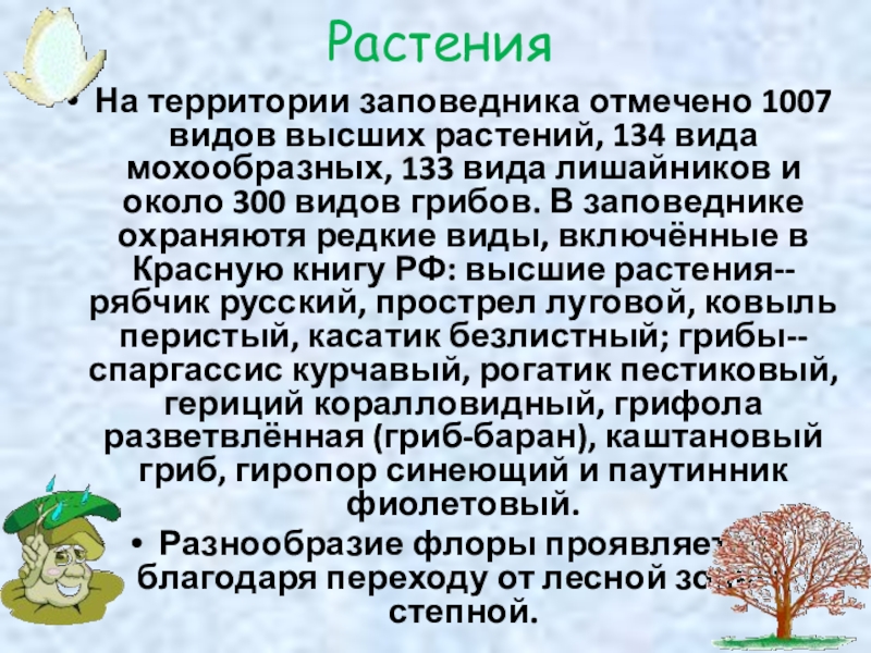 133 вида лишайников и около 300 видов грибов. В заповеднике охраняютя редкие виды, включённые в Красную книгу РФ: высшие растения--рябчик русский, прострел луговой, ковыль перистый, касатик безлистный; грибы--спаргассис курчавый, рогатик пестиковый, гериций коралловидный, грифола разветвлённая (гриб-баран), каштановый гриб, гиропор синеющий и паутинник фиолетовый.
