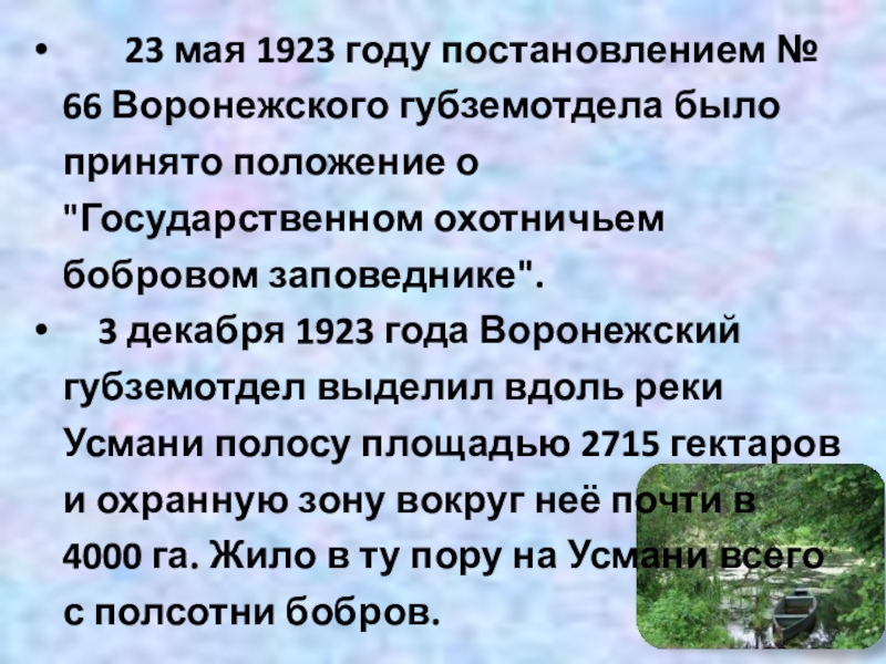 Воронежского губземотдела было принято положение о "Государственном охотничьем бобровом заповеднике".