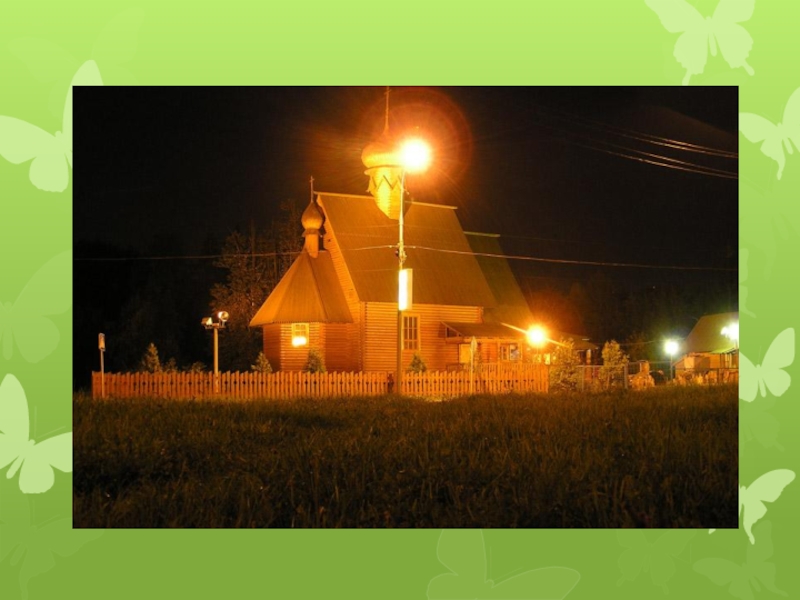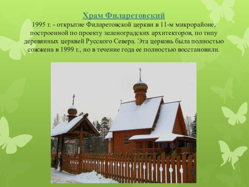 по проекту зеленоградских архитекторов, по типу деревянных церквей Русского Севера. Эта церковь была полностью сожжена в 1999 г., но в течение года ее полностью восстановили.