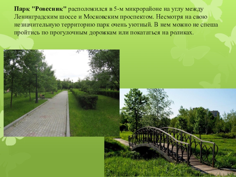 Слайд 26Парк "Ровесник" расположился в 5-м микрорайоне на углу между Ленинградским шоссе