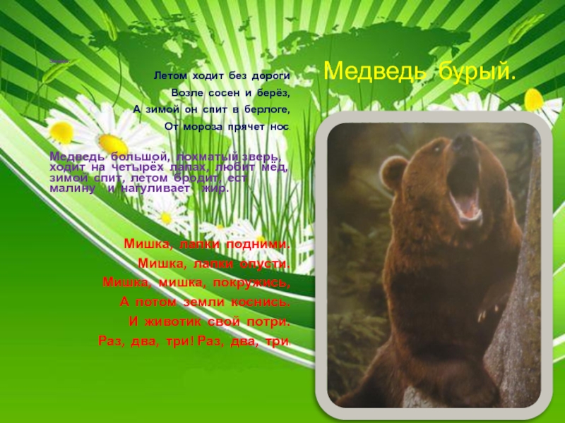 Медведь большой, лохматый зверь, ходит на четырёх лапах, любит мёд, зимой спит, летом бродит, ест малину и нагуливает жир.