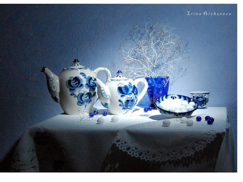 Белый чайничек из Гжели вам запомнится навек.Неужели – неужели это сделал человек?!