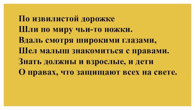 По извилистой дорожке  Шли по миру чьи-то ножки.  Вдаль смотря широкими глазами,  Шел малыш знакомиться с правами.  Знать должны и взрослые, и дети  О правах, что защищают всех на свете.