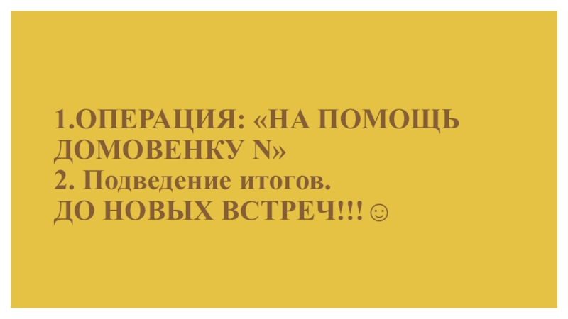 1.ОПЕРАЦИЯ: «НА ПОМОЩЬ ДОМОВЕНКУ N» 2. Подведение итогов. ДО НОВЫХ ВСТРЕЧ!!!