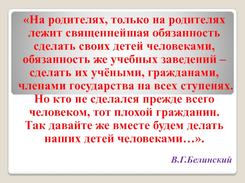 «На родителях, только на родителях лежит священнейшая обязанность сделать своих детей человеками, обязанность же учебных заведений – сделать их учёными, гражданами, членами государства на всех ступенях. Но кто не сделался прежде всего человеком, тот плохой гражданин.