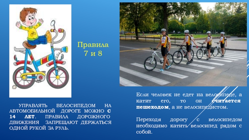 Если человек не едет на велосипеде, а катит его, то он считается пешеходом, а не велосипедистом.