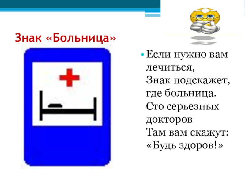 Знак «Больница» Если нужно вам лечиться, Знак подскажет, где больница. Сто серьезных докторов Там вам скажут: «Будь