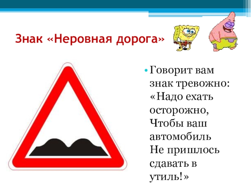 Знак «Неровная дорога» Говорит вам знак тревожно: «Надо ехать осторожно, Чтобы ваш автомобиль Не пришлось сдавать в