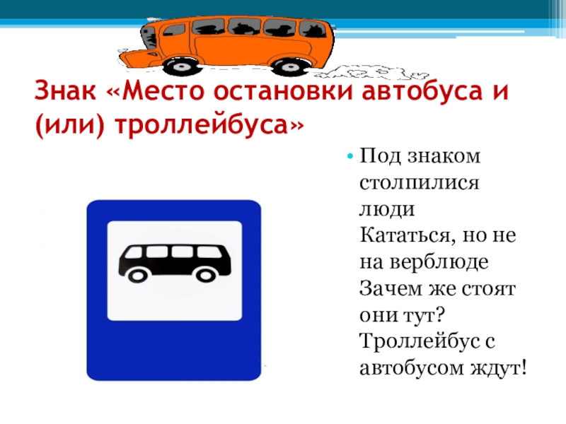 Знак «Место остановки автобуса и (или) троллейбуса» Под знаком столпилися люди Кататься, но не на верблюде Зачем