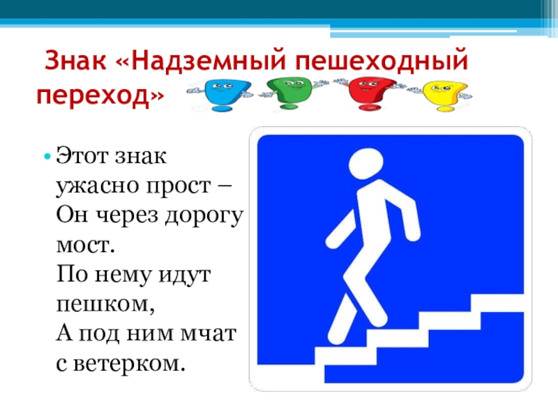 Знак «Надземный пешеходный переход» Этот знак ужасно прост – Он через дорогу мост. По нему идут пешком,