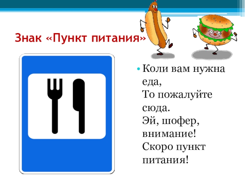 Знак «Пункт питания» Коли вам нужна еда, То пожалуйте сюда. Эй, шофер, внимание! Скоро пункт питания!