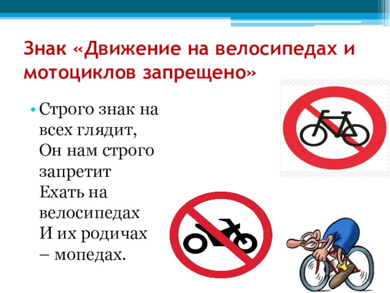 Знак «Движение на велосипедах и мотоциклов запрещено» Строго знак на всех глядит, Он нам строго запретит Ехать