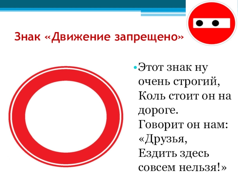 Знак «Движение запрещено» Этот знак ну очень строгий, Коль стоит он на дороге. Говорит он нам: «Друзья,