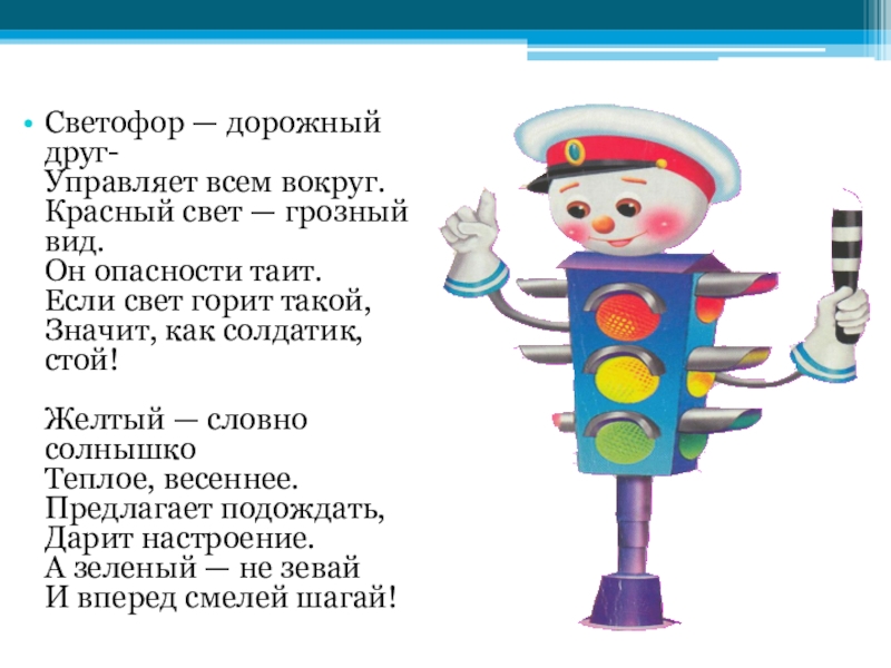 Светофор — дорожный друг- Управляет всем вокруг. Красный свет — грозный вид. Он опасности таит. Если свет