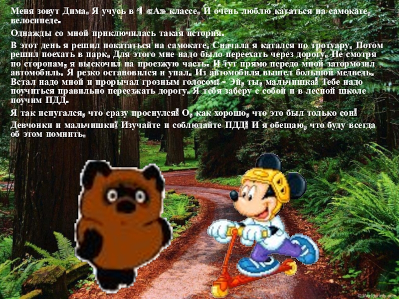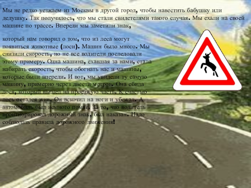 который нам говорил о том, что из леса могут появиться животные (лоси). Машин было много. Мы снизили скорость, но не все водители последовали этому примеру. Одна машина, ехавшая за нами, стала набирать скорость, чтобы обогнать нас и машины, которые были впереди. И вот, мы увидели ту самую машину, примерно через двести метров. Она сбила лося, который вышел на проезжую часть. К счастью лось остался жив. Он вскочил на ноги и убежал. А автомобиль был немного помят. За то, что водитель проигнорировал дорожный знак, был наказан. Надо соблюдать правила дорожного движения!