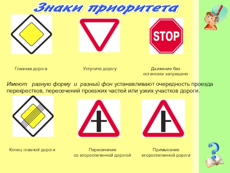 Имеют разную форму и разный фон устанавливают очередность проезда перекрестков, пересечений проезжих частей или узких участков дороги.