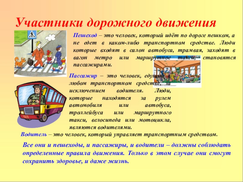 Все они и пешеходы, и пассажиры, и водители – должны соблюдать определенные правила движения. Только в этом случае они смогут сохранить здоровье, и даже жизнь.