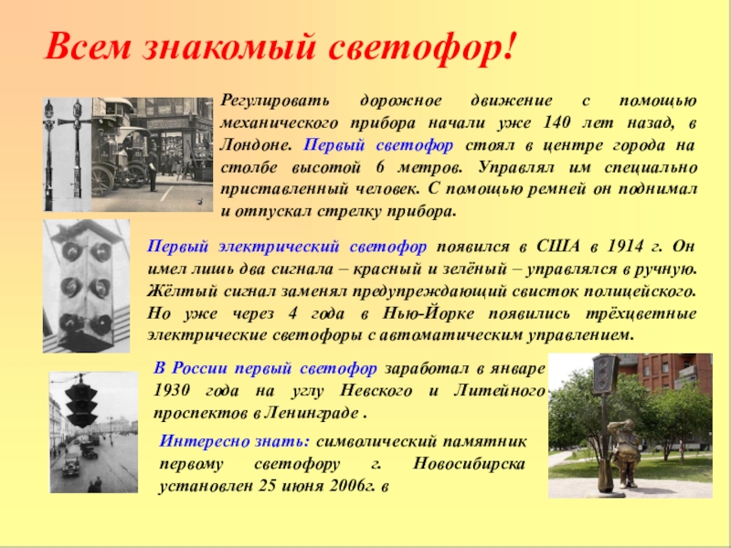 Первый электрический светофор появился в США в 1914 г. Он имел лишь два сигнала – красный и зелёный – управлялся в ручную. Жёлтый сигнал заменял предупреждающий свисток полицейского. Но уже через 4 года в Нью-Йорке появились трёхцветные электрические светофоры с автоматическим управлением.