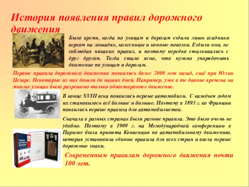 В конце XVIII века появились первые автомобили. С каждым годом их становилось всё больше и больше. Поэтому в 1893 г. во Франции появились первые правила для автомобилистов.