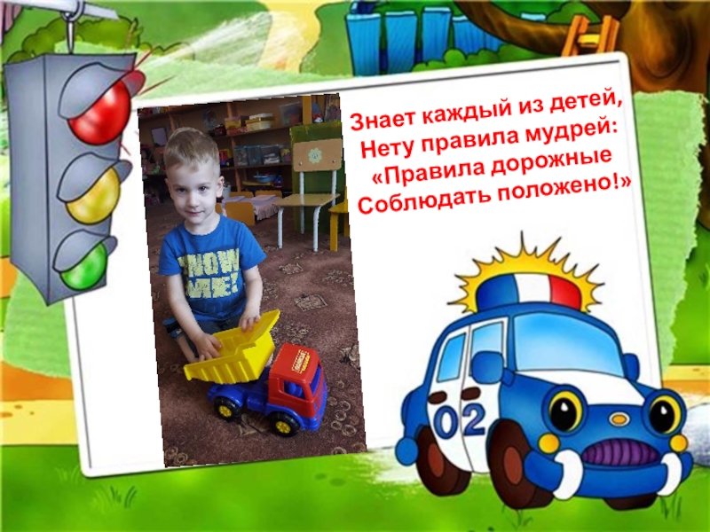 Слайд 8Знает каждый из детей, Нету правила мудрей: «Правила дорожные Соблюдать положено!»