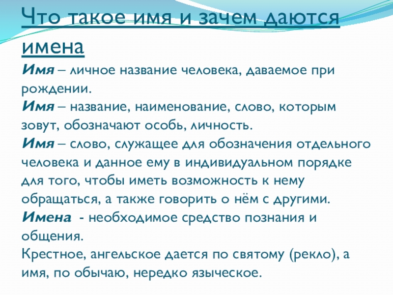 Имя – слово, служащее для обозначения отдельного человека и данное ему в индивидуальном порядке для того, чтобы иметь возможность к нему обращаться, а также говорить о нём с другими.