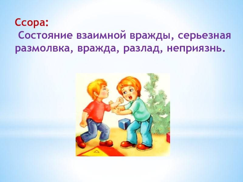Слайд 3Ссора: Состояние взаимной вражды, серьезная размолвка, вражда, разлад, неприязнь.