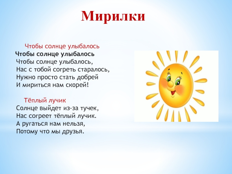 Чтобы солнце улыбалось Чтобы солнце улыбалось Чтобы солнце улыбалось, Нас с тобой согреть старалось, Нужно просто стать добрей И мириться нам скорей! Тёплый лучик Солнце выйдет из-за тучек, Нас согреет тёплый лучик. А ругаться нам нельзя, Потому что мы друзья.