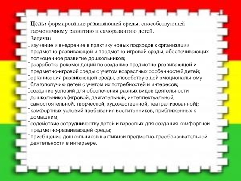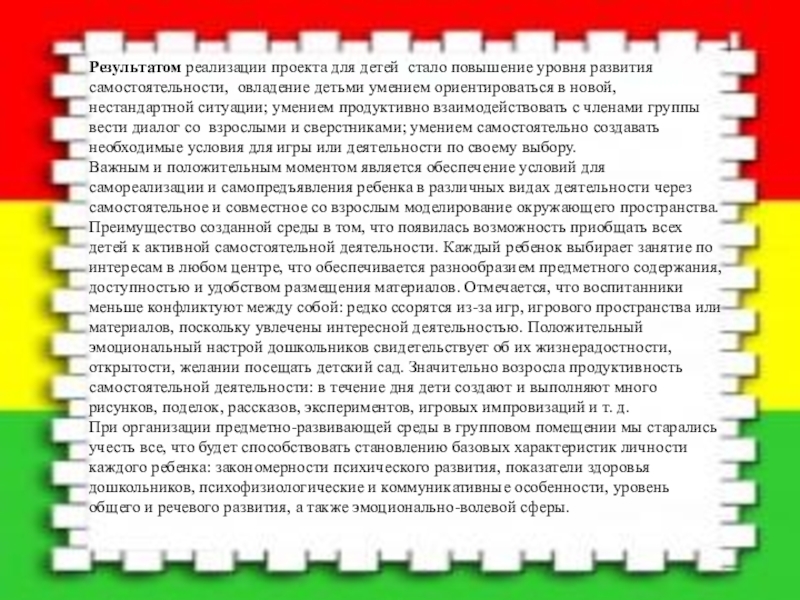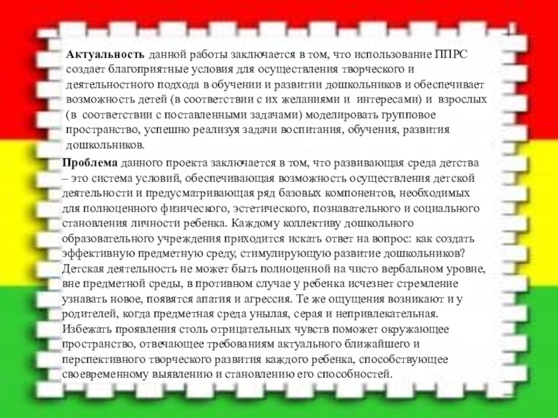 Актуальность данной работы заключается в том, что использование ППРС создает благоприятные условия для осуществления творческого и деятельностного подхода в обучении и развитии дошкольников и обеспечивает возможность детей (в соответствии с их желаниями и интересами) и взрослых (в соответствии с поставленными задачами) моделировать групповое пространство, успешно реализуя задачи воспитания, обучения, развития дошкольников.