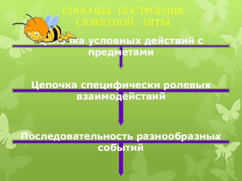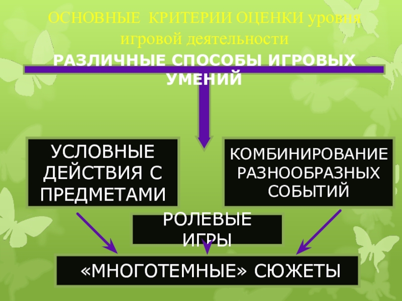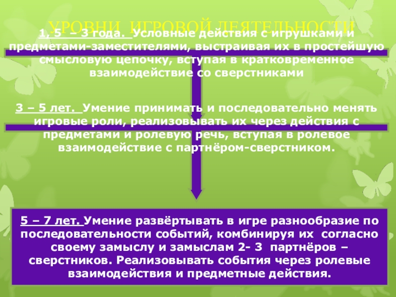 5 – 7 лет. Умение развёртывать в игре разнообразие по последовательности событий, комбинируя их согласно своему замыслу и замыслам 2- 3 партнёров – сверстников. Реализовывать события через ролевые взаимодействия и предметные действия.