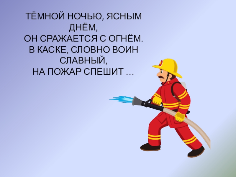 ТЁМНОЙ НОЧЬЮ, ЯСНЫМ ДНЁМ,ОН СРАЖАЕТСЯ С ОГНЁМ.В КАСКЕ, СЛОВНО ВОИН СЛАВНЫЙ,НА ПОЖАР СПЕШИТ …