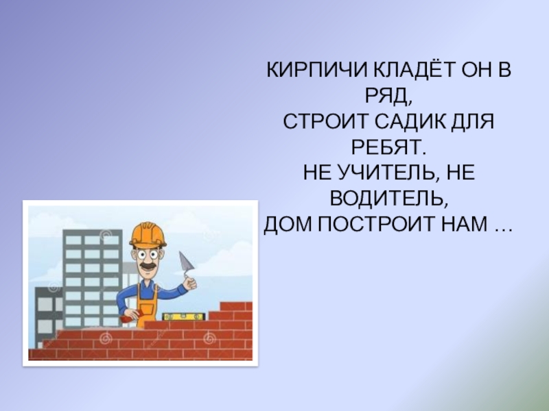 КИРПИЧИ КЛАДЁТ ОН В РЯД,СТРОИТ САДИК ДЛЯ РЕБЯТ.НЕ УЧИТЕЛЬ, НЕ ВОДИТЕЛЬ,ДОМ ПОСТРОИТ НАМ …