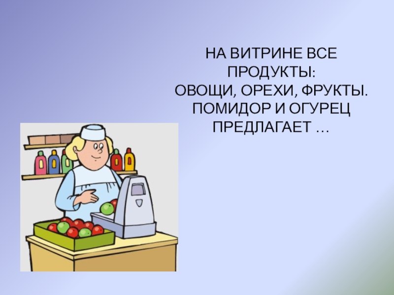 НА ВИТРИНЕ ВСЕ ПРОДУКТЫ:ОВОЩИ, ОРЕХИ, ФРУКТЫ.ПОМИДОР И ОГУРЕЦПРЕДЛАГАЕТ …