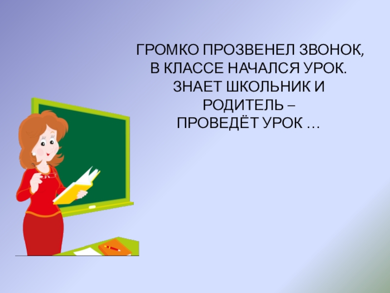 ГРОМКО ПРОЗВЕНЕЛ ЗВОНОК,В КЛАССЕ НАЧАЛСЯ УРОК.ЗНАЕТ ШКОЛЬНИК И РОДИТЕЛЬ – ПРОВЕДЁТ УРОК …