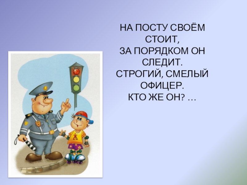 НА ПОСТУ СВОЁМ СТОИТ,ЗА ПОРЯДКОМ ОН СЛЕДИТ.СТРОГИЙ, СМЕЛЫЙ ОФИЦЕР.КТО ЖЕ ОН? …